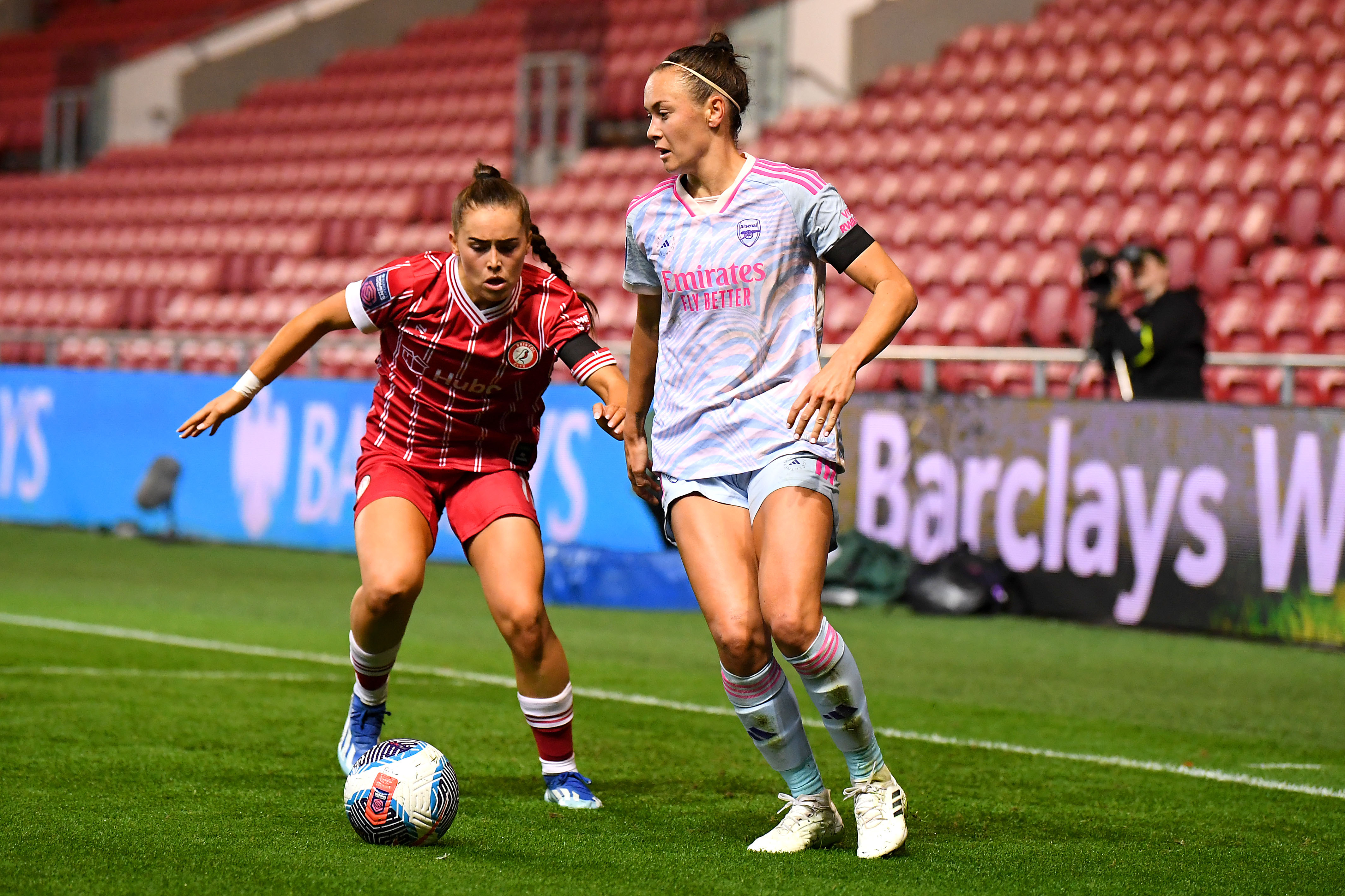 Caitlin Foord of Arsenal on the ball during the Barclays Women´s Super League match between Bristol City and Arsenal FC at Ashton Gate Stadium on October 22, 2023 in Bristol, England. (Photo by Alex Burstow/Arsenal.com)